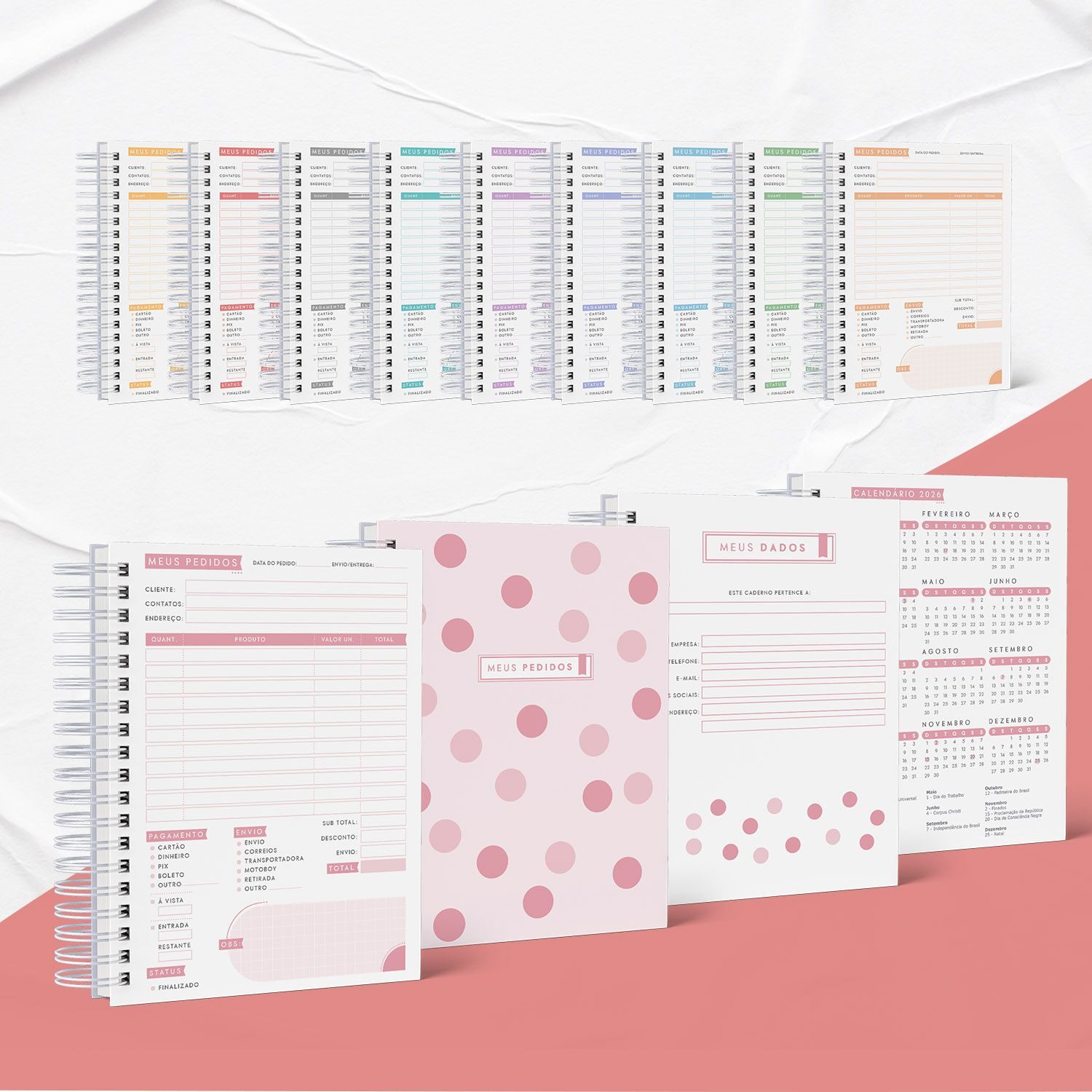 Miolo Caderno de Pedidos Minimalista – 10 cores + Capas + Páginas Iniciais (dados + calendário 2026)